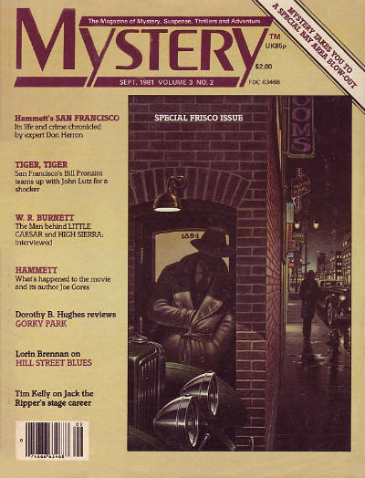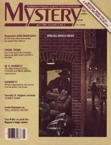Every now and then I would do an article based on the experience of tracking down these books. The first version appeared under the title “San Francisco Mysteries” in a special Frisco issue of the magazine Mystery dated September 1981. I even included a checklist of all the local mystery novels I knew of at the time. For the summer 1993 issue of The Argonaut: The Journal of the San Francisco Historical Society, I retooled that earlier article a bit and added a sidebar called “Histories and Mysteries,” pointing out how you can track down some pretty interesting local info if you just read enough crime novels.