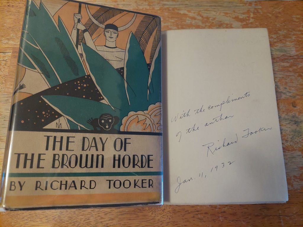 I have a signed copy of Richard Tooker’s Jack London-inspired prehistoric fiction The Day of the Brown Horde, but mine did not have a jacket. Now thanks to a sale from Currey, it does.