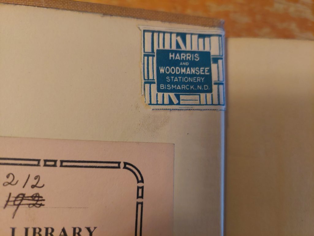 One cool thing about my original copy is that it bears a stamp from a store called Woodmansee’s in Bismarck from the early thirties. Back in the sixties my brothers and I haunted that place, buying from their stock of true Western books. They always had a good selection, James D. Horan and others. (Although how factual Horan was remains a debatable point.) Upon their poster board we drew pictures of artistic excellence. Good memories.