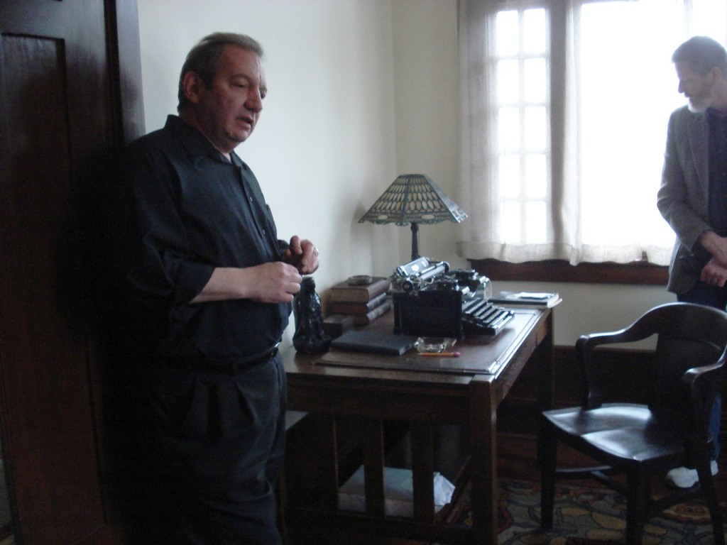 Bill can be seen above, on the left, regaling a tour that stopped into the Sam Spade apartment in 891 Post after his years as the tenant — the apartment where Dashiell Hammett wrote The Maltese Falcon, and where Spade lives in the course of the novel.