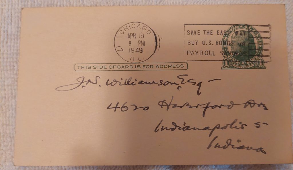 But I realized one more never hurts, so I browsed the web and found a holograph postcard from no less than Vincent Starrett written to a very young Williamson, he’s only about seventeen. Pretty cool, huh?