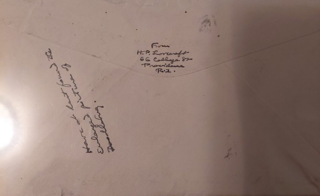 — Envelope addressed from the UK to HPL, with HPL handwritten note saying “Please return to HP Lovecraft” and giving his address — $360