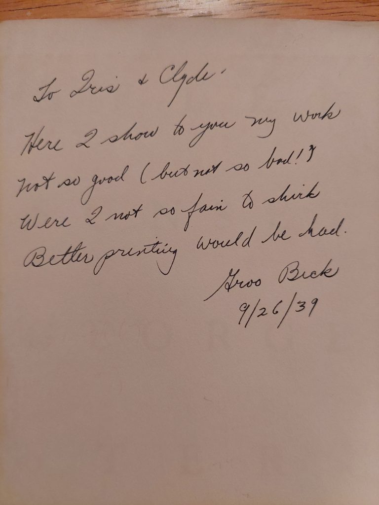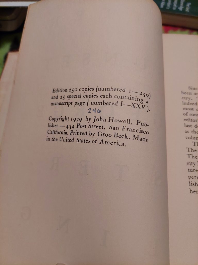 The Groo Beck inscription comes from After Sunset, a book of poems by George Sterling — they had sent a copy along to Kline to show as an example of their work. Published under the eponymous imprint of San Francisco bookseller John Howell, Barlow usually is credited as editor and Groo as the printer. In Barlow’s short autobiography, collected in O Fortunate Floridian, he writes that Beck did 90% of the work from a manuscript the bookseller Howell had. He says the book made expenses.