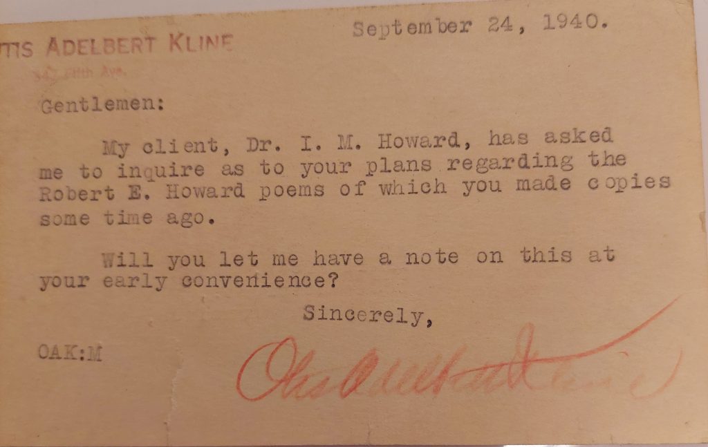 (The timeline of the whole Howard-Kline-Druid correspondence remains a bit murky. The doc burned a bunch of Howard’s poems by mistake and then, around 1943, wanted to know if Druid Press had made copies.)
