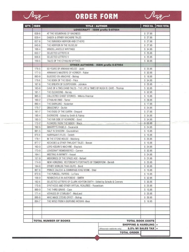 But Paul also collects the ephemera that followed the 1971 death of Arkham publisher August Derleth — the Modern Era. Only recently Haefele took on that subject himself for Firsts, with a history of the post-Derleth press in one issue, and a checklist of Items in the following number for November/December 2019.