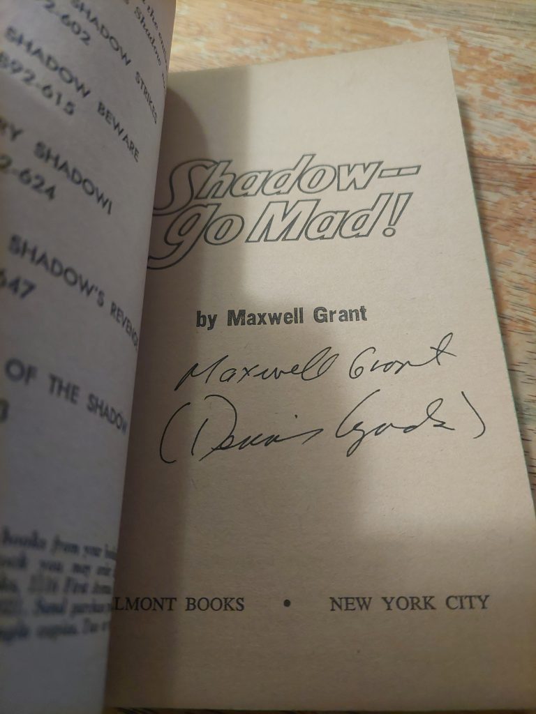 Brian Leno per norm supplies the signature, this time from the 1960s run of Belmont paperback originals of The Shadow ghosted by Dennis Lynds under the house name Maxwell Grant. Typically denigrated as a “Spy-Fi” reading of the character, not up there with the near 300 short novels done for The Shadow Magazine by Walter B. Gibson. Lynds did all of the Belmont PBOs, except the first one — The Return of the Shadow. That one came off Gibson’s typewriter and of course is considered canonical.