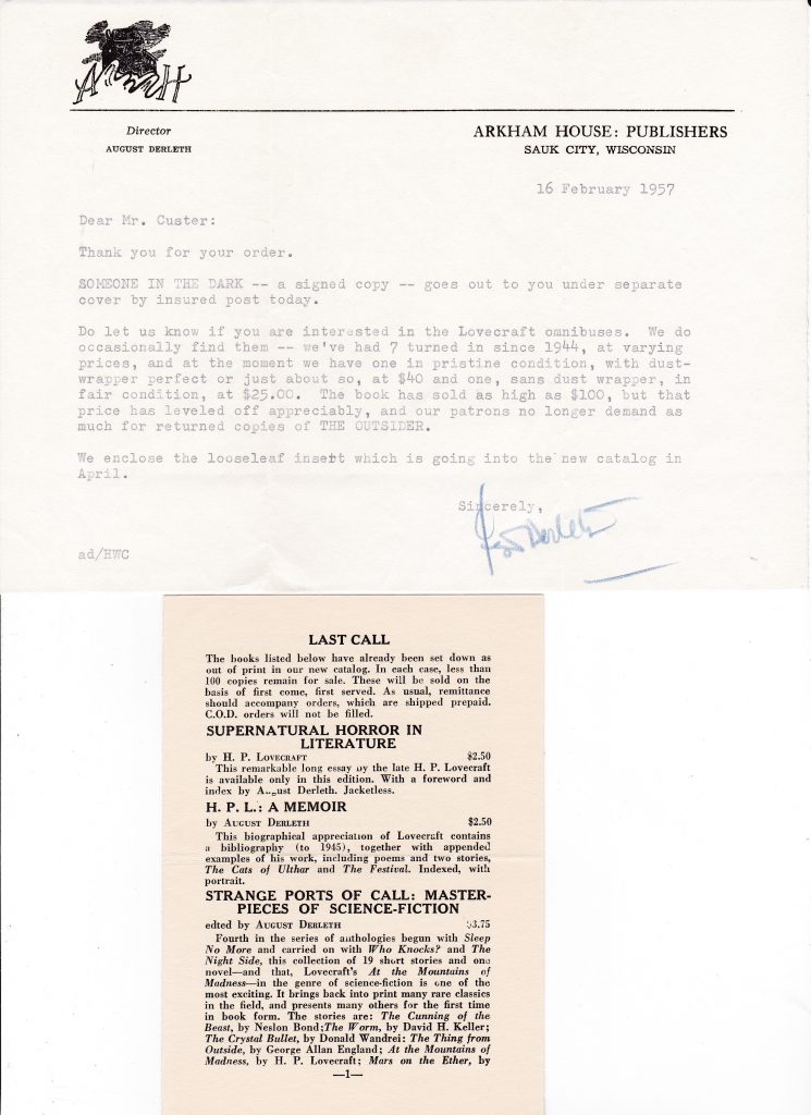 The Last Call brochure is no. 43 in the Firsts list (and does not appear in the Phil Mays list), with the note from Derleth it goes with incontrovertibly recording that this one copy is going out months before the 1957 Stock List. (And wouldn’t some of you liked to have had the chance to grab that copy of The Outsider and Others for $40?)