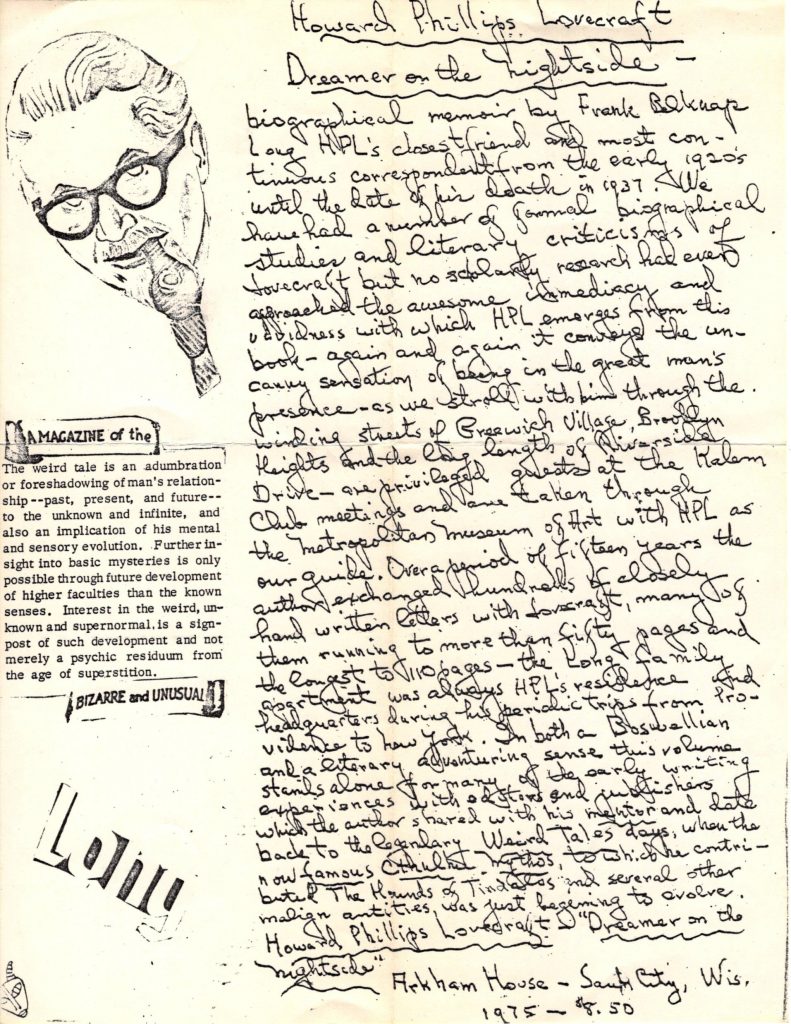 I thought some of you might like a look at the Long Item. You won’t find it on Haefele’s checklist of the Modern Ephemera, because it is not a piece of official in-house Arkham publicity. Looks to be something Long threw together himself to promote the book for the release in 1975. Haefele covers the saga of that title’s delays and problems in his article.