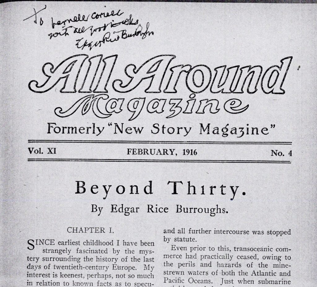 “Edgar Rice Burroughs literally signed hundreds of books during his lifetime, but apparently only signed three pulp magazines that are known. For Forrest Ackerman he signed a copy of the October 1912 issue of All-Story with ‘Tarzan of the Apes.’ That magazine was auctioned off for something in the 40-50K range. For Vernell Coriell he also signed another October 1912 issue of All-Story — but also signed the February 1916 issue of All Around Magazine which contained his ‘Beyond Thirty.’ That All Around issue is easily the rarest pulp to ever include a Burroughs story.