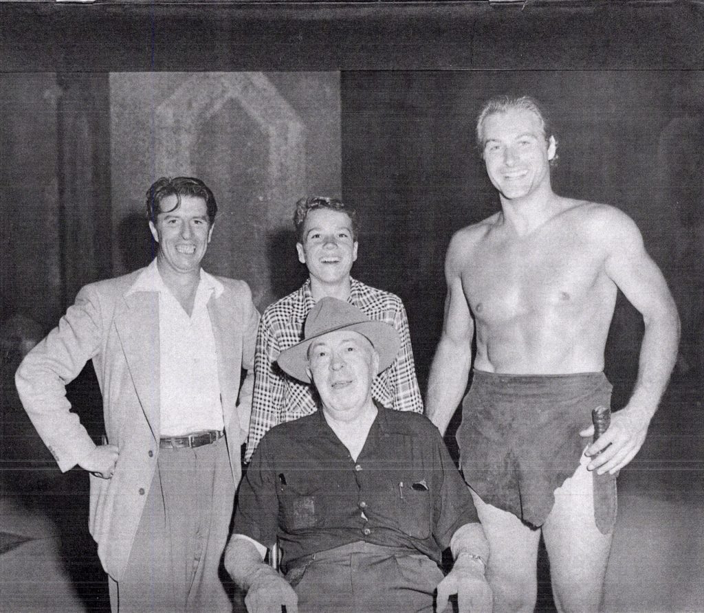 “This 1949 visit was also the scene of the last known photo of ERB, made at the movie studio. The photograph was printed as the inside back cover of Larry Ivie’s Monsters and Heroes #4, March 1969. Burroughs is seated in a wheelchair. Behind him l. to r. are Coriell, founder of the official ERB fan club, ERB’s grandson Mike Pierce, and Lex Barker, wearing the loincloth as the current cinematic Tarzan.