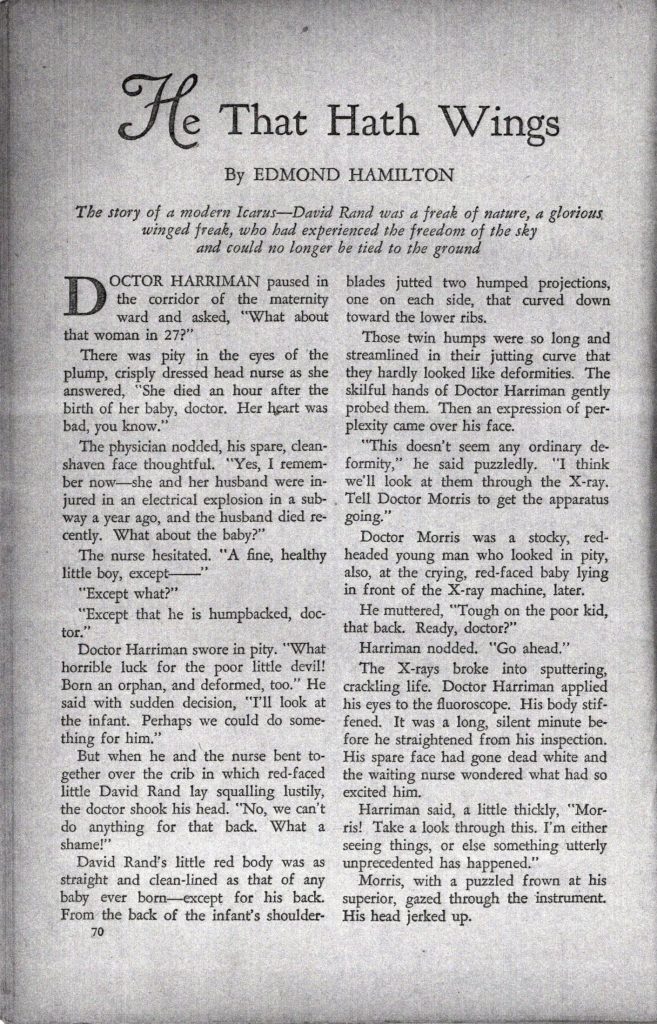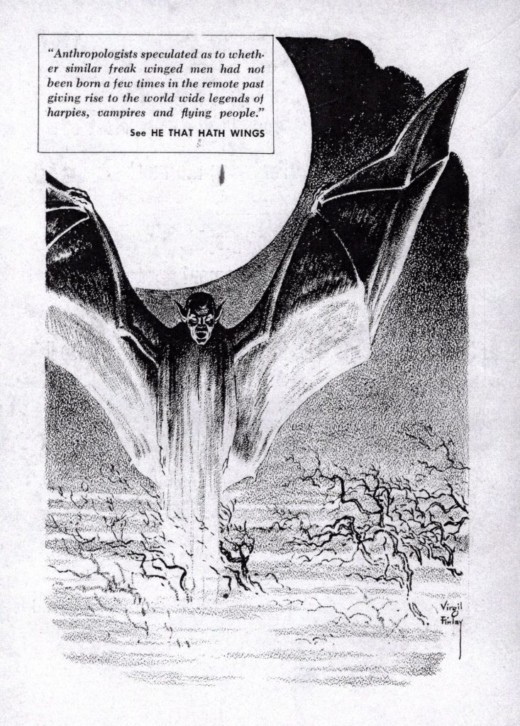 Readers of that issue of Weird Tales were curious to find that the first five stories in the issue were accompanied by Virgil Finlay illustrations, but the rest of the stories — including “He That Hath Wings” — lacked illustrations.