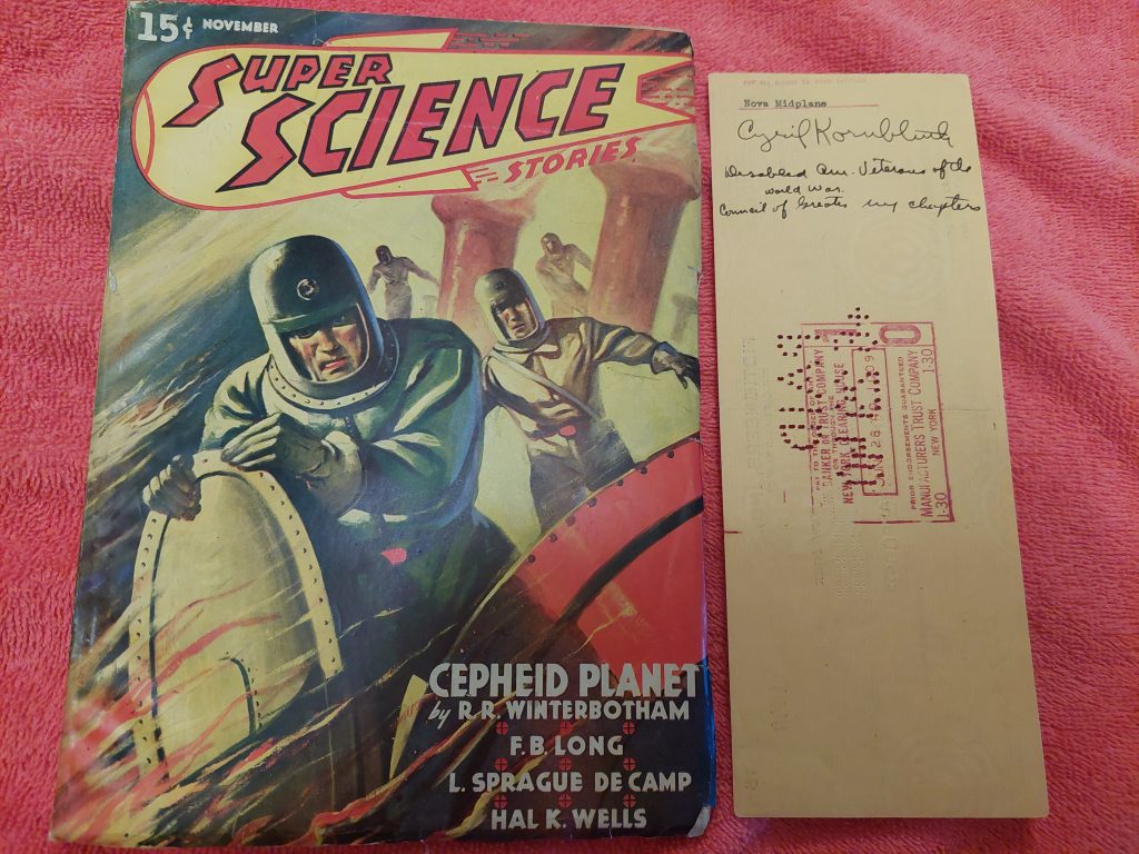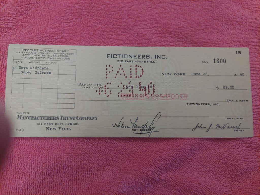 Our resident Autograph Hound Brian Leno of course has something to talk about in the form of a signed cheque to Kornbluth. Brian says, “Here’s my Kornbluth with the magazine appearance he got paid for, under a pseudonym.”
