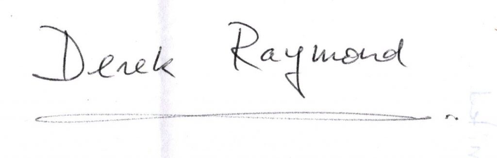 His autograph is from the first Raymond book, He Died with His Eyes Open (Martin Secker & Warburg Limited, 1984). That volume is also the first book of his acclaimed Factory Series where Raymond’s unnamed police officer works in the Bureau of Unexplained Deaths.
