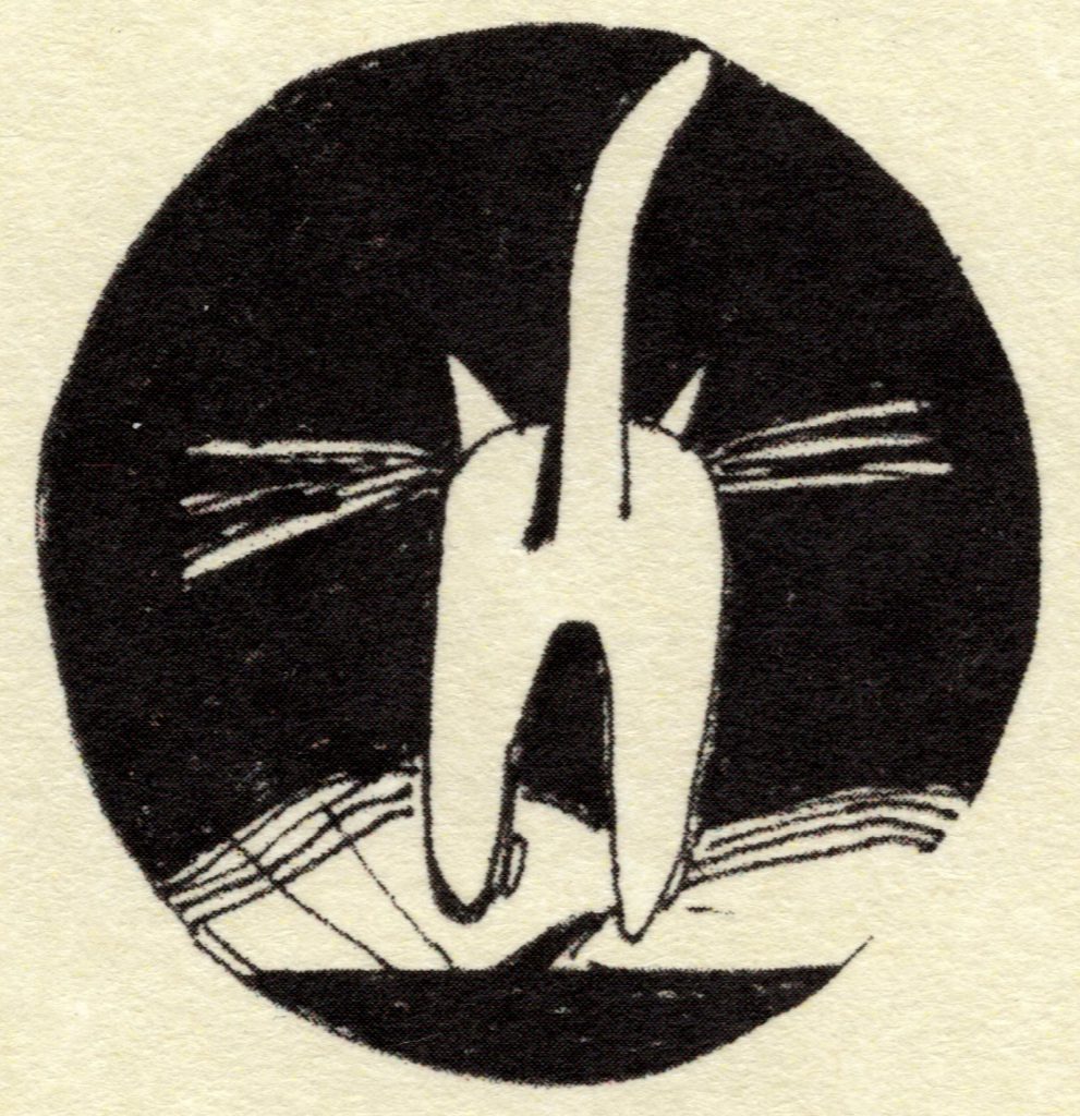 “I created the Hesperia Press cat butt in 2001,” Haefele tells me, “when celebrating in the EOD the achievement award won that year by Marc Michaud of Necronomicon Press. If you look at the NP logo, you will see that they have a black cat in a circle, facing forward, and sitting against a white background.