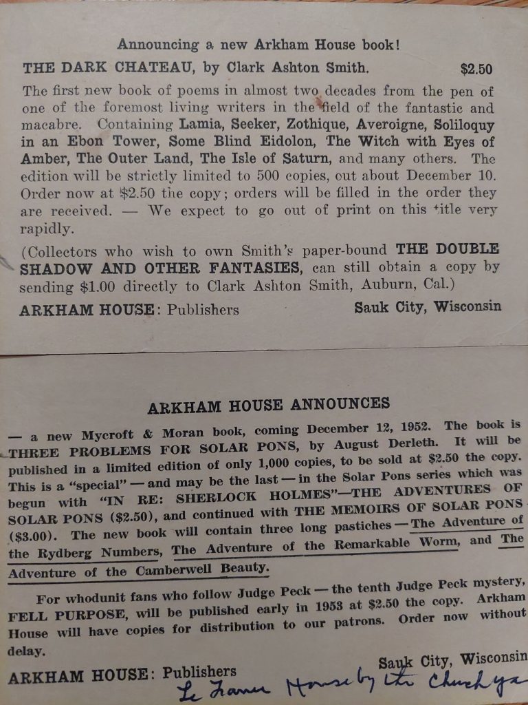 Courtesy an eagle-eyed bud of mine, ever perched over eBay, I landed a couple of Items of Arkham House ephemera I needed just a couple of days ago.