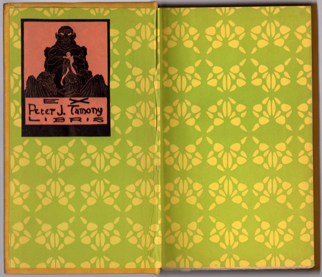 I pulled my Knopf yellowback of Adventure out from my horde of thirteen yellowback Knopfs to check the date as we were figuring it out. Noticed that it bears the very cool bookplate of one Peter J. Tamony — the demonic Buddha image comes from the famous illustrator Wallace Smith. I’m pretty sure I have another book somewhere in my collection — maybe even a couple more — that have the Tamony bookplate pasted in. As I’ve said before, I kind of like bookplates and other such things — stamps, bookstore stickers — in old books.