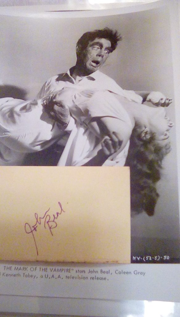 Sharp photo with a signed card by John Beal. Poor guy better get a shave if he wants to have any chance at romance with the fainting beauty.