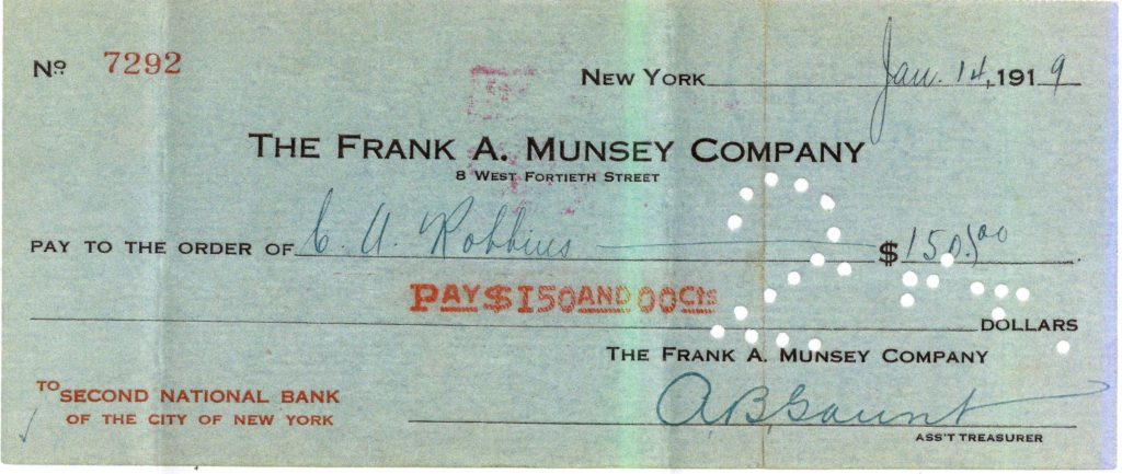 Kevin reports that while the cheque paid for a story titled “In Brangler Hall,” the final published version appeared with the title “Wild Willie, the Waster” — as by Tod Robbins — in the February 14, 1920 issue of All-Story Weekly.