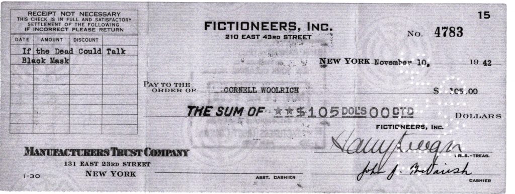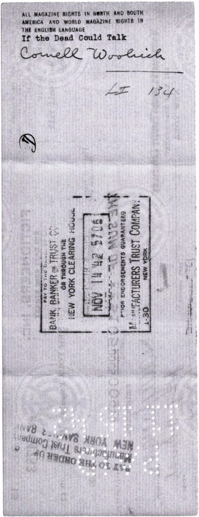 The noted book and pulp collector Kevin Cook decided to dive into his holdings and dig out the autograph of Cornell Woolrich — on a check for the story “If the Dead Could Talk” from the February 1943 issue of Black Mask.