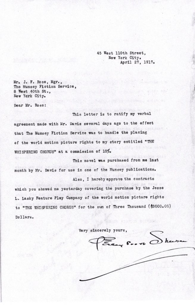 “The letter here deals with motion picture rights. The movie rights for The Whispering Chorus went for $3,000.00, and Sheehan pocketed $2.700.00 after Munsey’s 10% commission.