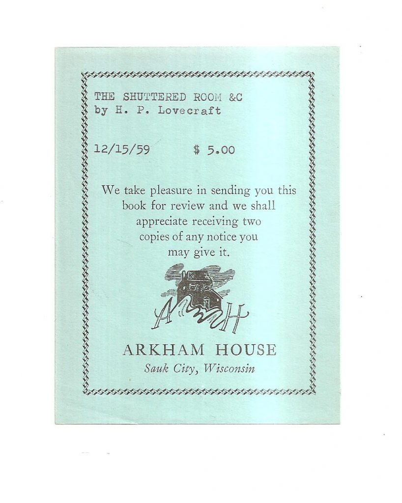 And Paul Dobish Jr made a plea for recognition of the review slips that went out with review copies from Derleth’s various imprints. Yes, sure, those items are interesting, but I cut the Gordian Knot by saying that I would “regard the review slips as desirable extras in the actual review copies, parts of a book, like the dustjacket.”