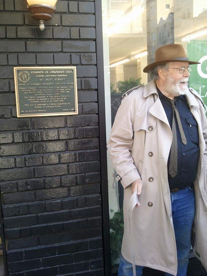Pic below, same basic image — standing next to the plaque mounted next to the doorway of 891 Post, the building where Hammett wrote The Maltese Falcon, the building where Sam Spade lives in the novel. But this one dates from the tour by appointment I did for Sisters in Crime on August 5, 2017: